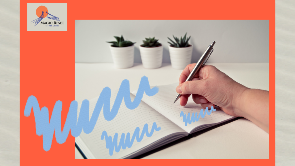 Try to write down your thoughts as fast as possible. You will see that your thoughts and feelings will come quicker than your hand can write everything down… that is fine…. It can be scribbles, rounds, lines… it doesn’t matter. Everything is allowed. Only make sure to write as fast as you can with all the thoughts that come up. Notice the emotions that are present.